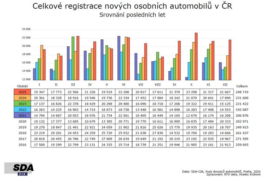 Registrace nových osobních automobilů v České republice v roce 2025 proti roku 2024 vzrostly o 7,39 % z 231 600 na 248 719 vozidel, což je o 7,4 % víc (o 17 119 vozů) než v roce 2024. V prosinci meziročně dokonce vzrostly o 21,11 % na nejvyšší hodnotu od roku 2016. Podíl firemních vozidel činí 74,4 %, soukromých 25,6 %.