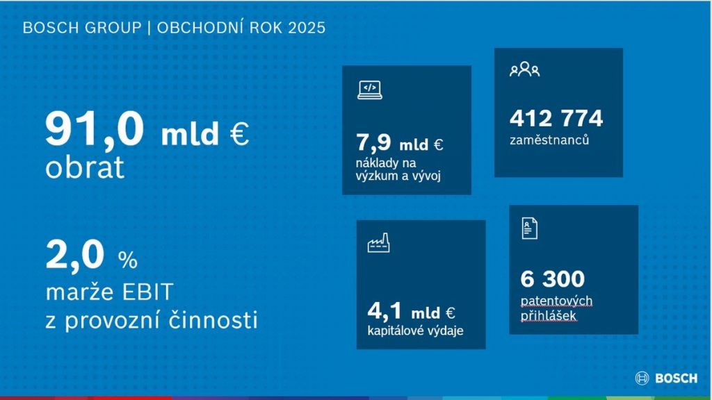 Navzdory problémům Bosch v obchodním roce 2025 dosáhl obrat 91 miliard eur, což představuje mírný nárůst oproti předchozímu roku (2024: 90,3 miliardy eur). Po očištění od vlivů směnných kurzů to odpovídalo růstu o 4,1 %. EBIT marže z provozní činnosti na úrovni 2 % byla nižší než v předchozím roce (2024: 3,5 %). Nezbytné strukturální a personální úpravy pro zvýšení budoucí životaschopnosti měly na tento výsledek značný negativní vliv v podobě rezerv ve výši 2,7 miliardy eur.
