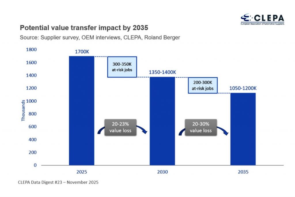 Pokud budou současné trendy pokračovat, tvorba hodnoty v oblasti výroby automobilových dílů v Evropě by se do roku 2030 mohla snížit až o 23 %. Tento pokles odráží jak nižší objem výroby, tak i sníženou hodnotu na komponenty, jelikož se skladba pohonných jednotek a tvorba hodnoty se přesouvá do zahraničí. Dopad na zaměstnanost je značný: do roku 2030 by mohlo být ohroženo až 350 000 pracovních míst.