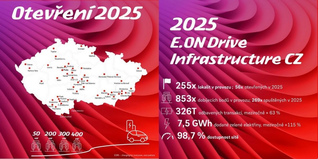 Společnost E.ON Drive Infrastructure, která v rámci skupiny E.ON staví a spravuje veřejnou dobíjecí síť, uzavřela rok 2025 s 255 lokalitami s 850 dobíjecími body. V uplynulém roce přibylo 56 nových lokalit s 269 dobíjecími body. Zatímco na jaře loňského roku bylo v síti E.ON Drive 100 dobíjecích ultrarychlých bodů, na jeho konci už jich je 230.